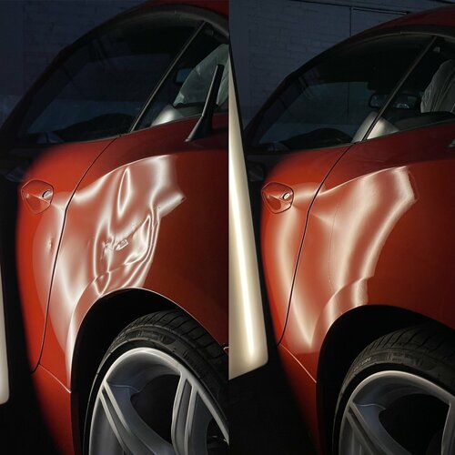 Выпрямил вмятину с ребром жёсткости на 100 %, когда другие мастера утверждали, что без покраски и шпаклёвки самой детали не обойтись.